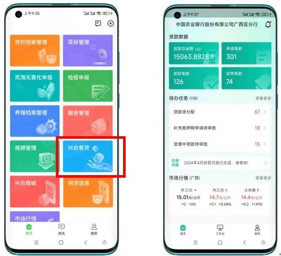 图8 养户端-桂牧通APP-贷款申请/银行端-兴农易贷APP-贷款审核