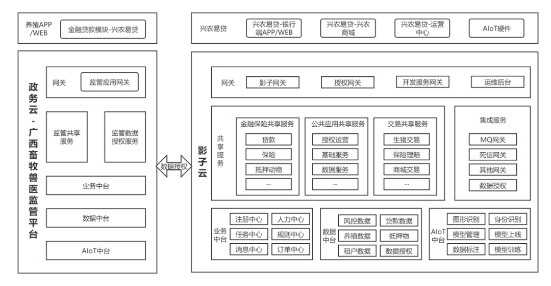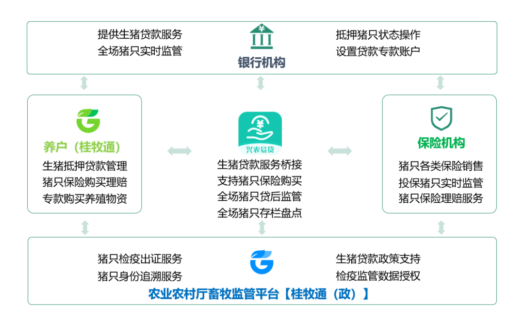为切实解决养殖企业长期面临的贷款融资难的问题,在广西农业农村厅和地方金融监督管理局的监管与指导下,建设畜禽活体抵押贷——兴农易贷平台,创新性地以政府检疫耳标为抵押物标识,通过检疫出证实现抵押物管控,并依托北部湾大数据交易中心,将广西畜牧兽医智慧监管服务平台的全流程公共数据进行脱敏处理,授权兴农易贷平台运营。平台以AI技术作为全场管控核心,为金融机构打造大数据风控体系,同时通过供应链企业,实现贷款资金专款专用,资金监管闭环,有效降低银行放款风险,解决养殖户融资难题,推动行业高质量发展。