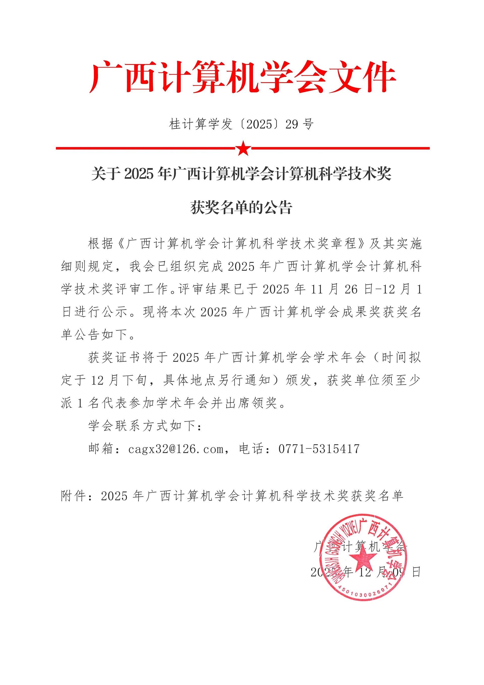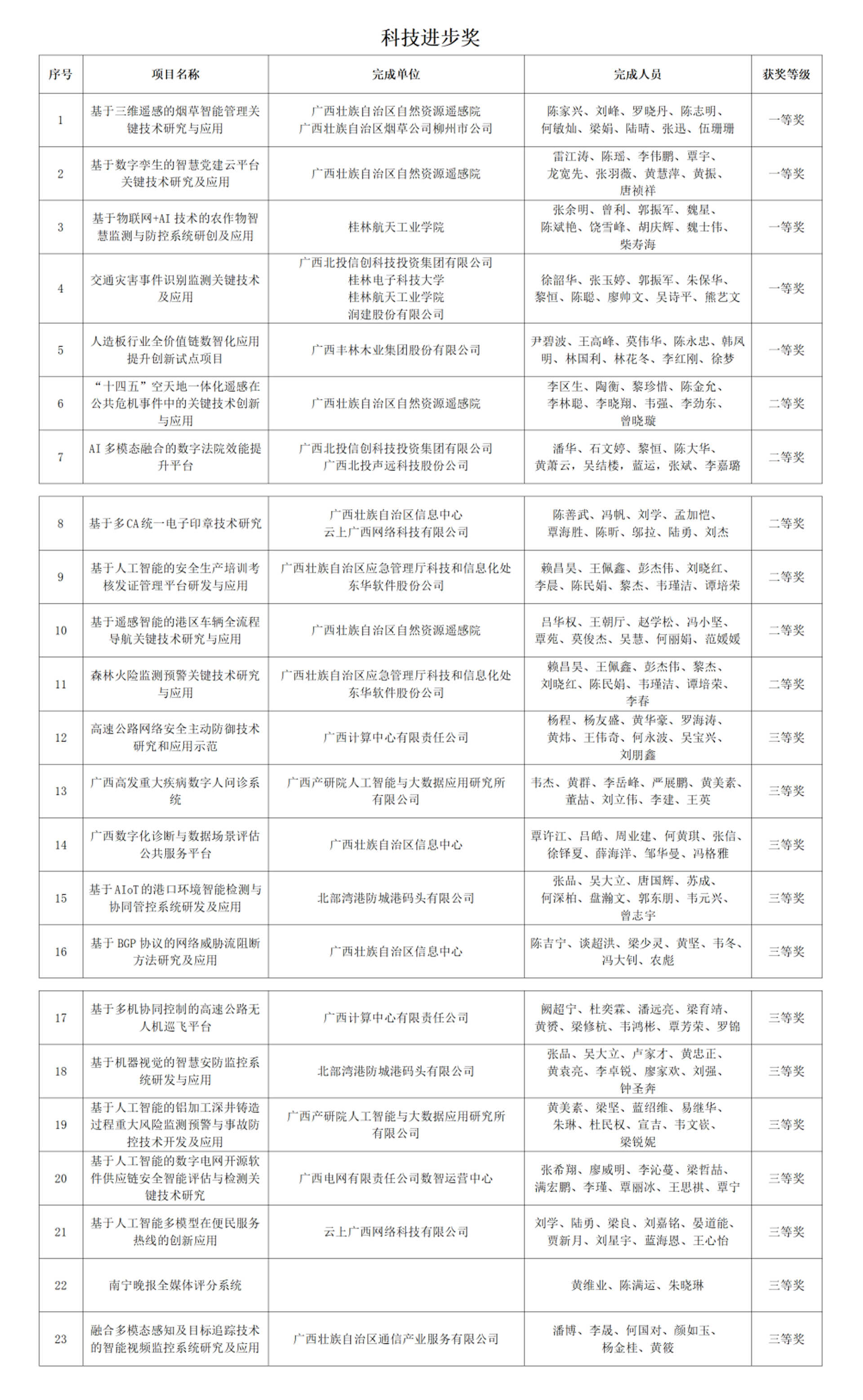 近日,广西计算机学会发布了2025年计算机科学技术奖获奖名单,自治区信息中心荣获科技进步二等奖1项、三等奖2项。 广西计算机学会科技进步奖是由广西计算机学会每年组织一次,就我区计算机工作者在应用、开发、科研等方面的成果进行评定。